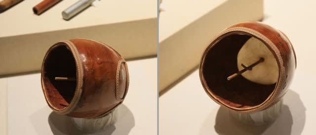 楽器と言うより、音を出すものを集めた感もあり、小鳥や動物をおびき寄せる笛などが多く展示されていましたが、そちらは20日に見所解説のトークがあるそうで、その時また来るとして、初めて見た楽器が月琴(下左)。