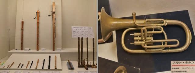 大から小まで揃えたリコーダーの近くには管楽器。管楽器製造は軍の需要から来たと言われますが、昔は陸軍のニッカン海軍のタナベと言われたそうで、その二大メーカーだったタナベのアルト・ホルンを初めて見ました。